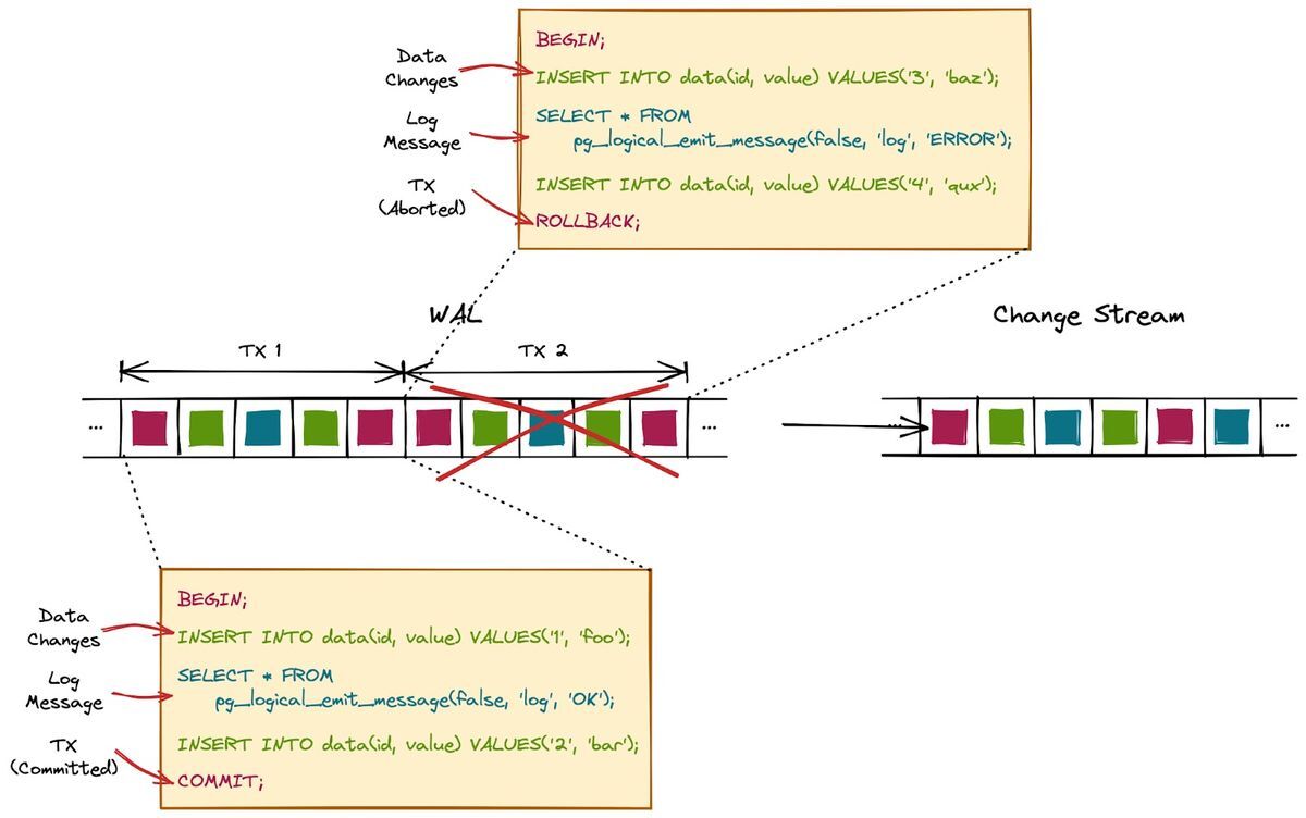 그러나 logical decoding message 는 트랜잭션이 아니었기 때문에 여전히 WAL에 기록되어 검색할 수 있다.