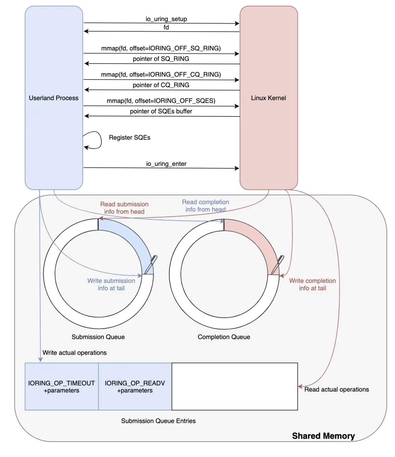 기본적으로 IO_uring은 사용자 공간(user-space)과 커널 공간(kernel-space) 사이에 공유된 두 개의 링 버퍼(ring buffer)를 이용합니다. 하나는 submission queue로, 사용자 공간에서 생성된 I/O 요청들을 커널에 전달하기 위해 사용되며, 다른 하나는 completion queue로, 완료된 I/O 작업들을 커널에서 사용자 공간으로 전달하기 위해 사용됩니다. 이러한 구조는 시스템 콜의 횟수를 줄이고, context switch를 최소화하여 성능을 향상시킵니다.